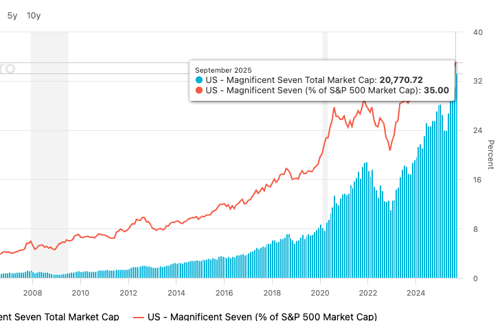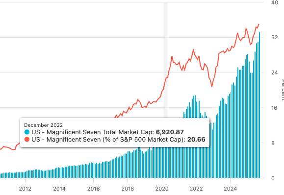 The market seems to agree with Karpathy, and has priced in a staggering amount of future growth. As the charts clearly show, the total market capitalization of the 'Magnificent Seven'—which forms the core of the AI industry—exploded from a low of $6.92 trillion in December 2022 to $20.77 trillion today.