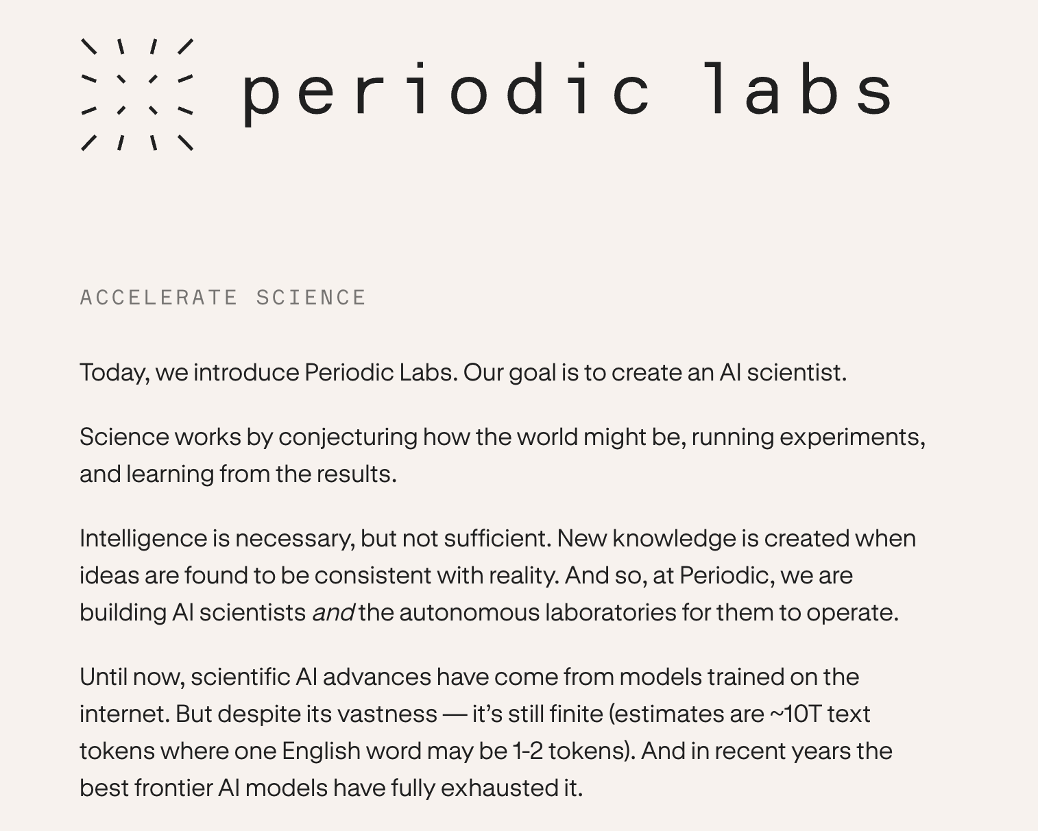 Periodic Labs, backed by a16z, Nvidia, Jeff Bezos, and Eric Schmidt, is solving AI's dirty secret: models crush math and code but fail at real physics and chemistry. Why? They've exhausted the internet's ~10 trillion training tokens, and the scientific literature is too noisy to learn from.