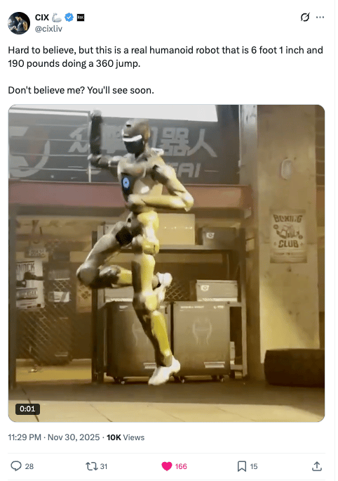 Not to start another blurb with more robot content, but we spent way too much time this weekend watching a 6-foot-1, 190-pound humanoid do a full 360-degree jump. The video was shared by the guy basically making the equivalent of robot UFC matches, and honestly, it's both impressive and slightly terrifying.