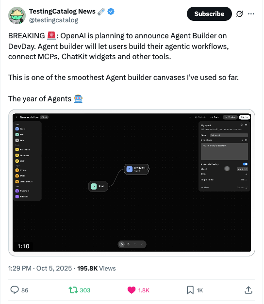 Next up: OpenAI's DevDay kicks off today, and leaks from this weekend suggest they're unveiling “Agent Builder”, a drag-and-drop canvas for building AI agent workflows without code: