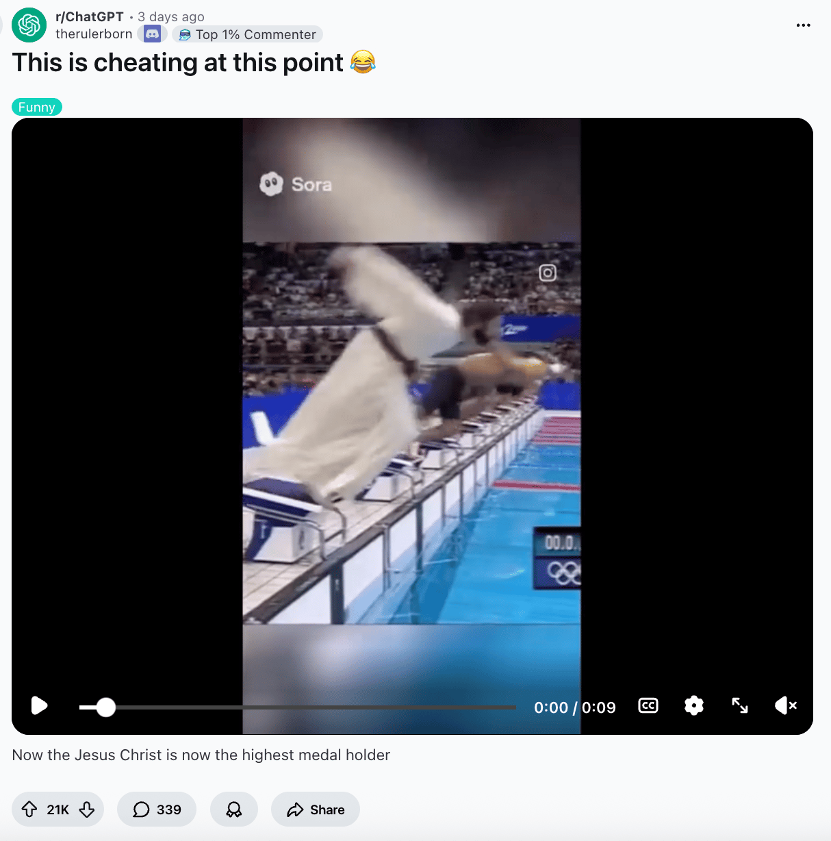 Olympics memes are going viral on Sora, and they’re actually quite creative; for example, here’s Jesus competing in Olympics swimming…